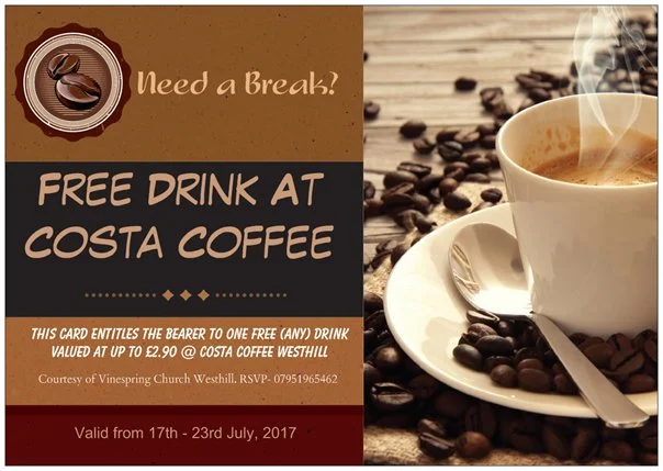 Following the success of last year's 'Coffee outreach', we will begin with our Free Drink Offer which we have created in collaboration with Costa Coffee Westhill. Our team will be handing out the vouchers in the town centre from the 17th through the 21st of July 2017. The vouchers will be valid till Sunday the 23rd of July 2017, and will be available for the first 250 persons who would take advantage of this gesture. "If anyone is thirsty, let him come.." John 7:37